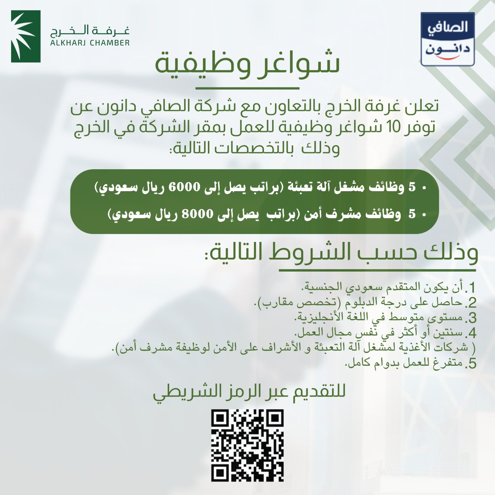 تعلن غرفة الخرج بالتعاون مع شركة الصافي دانون عن توفر (10) شواغر وظيفية للعمل في مقر الشركة في محافظة الخرج، على النحو التالي: